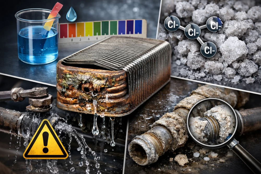 Jeigu vanduo yra per rūgštus arba jame yra per daug chloridų, gali prasidėti nerūdijančio plieno korozija. Tokiu atveju plokštėse atsiranda mikroskopiniai pažeidimai, kurie laikui bėgant gali virsti pratekėjimais.
